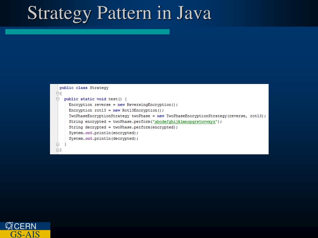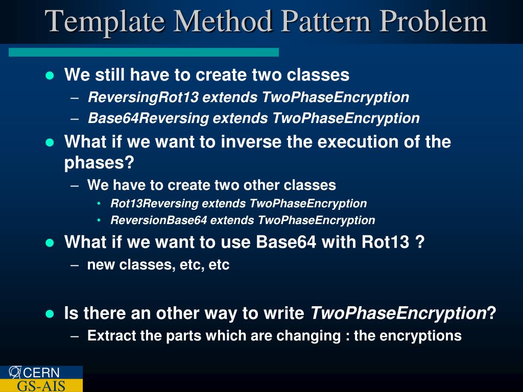 Template Method Pattern Problem • Westill have to createtwo classes • ReversingRot13 extendsTwoPhaseEncryption • Base64Reversing extendsTwoPhaseEncryption • What if wewant to inverse the execution of the phases? • We have to createtwoother classes • Rot13Reversing extendsTwoPhaseEncryption • ReversionBase64 extendsTwoPhaseEncryption • What if wewant to use Base64 with Rot13 ? • new classes, etc, etc • Is there an otherway to writeTwoPhaseEncryption? • Extract the parts which are changing: the encryptions