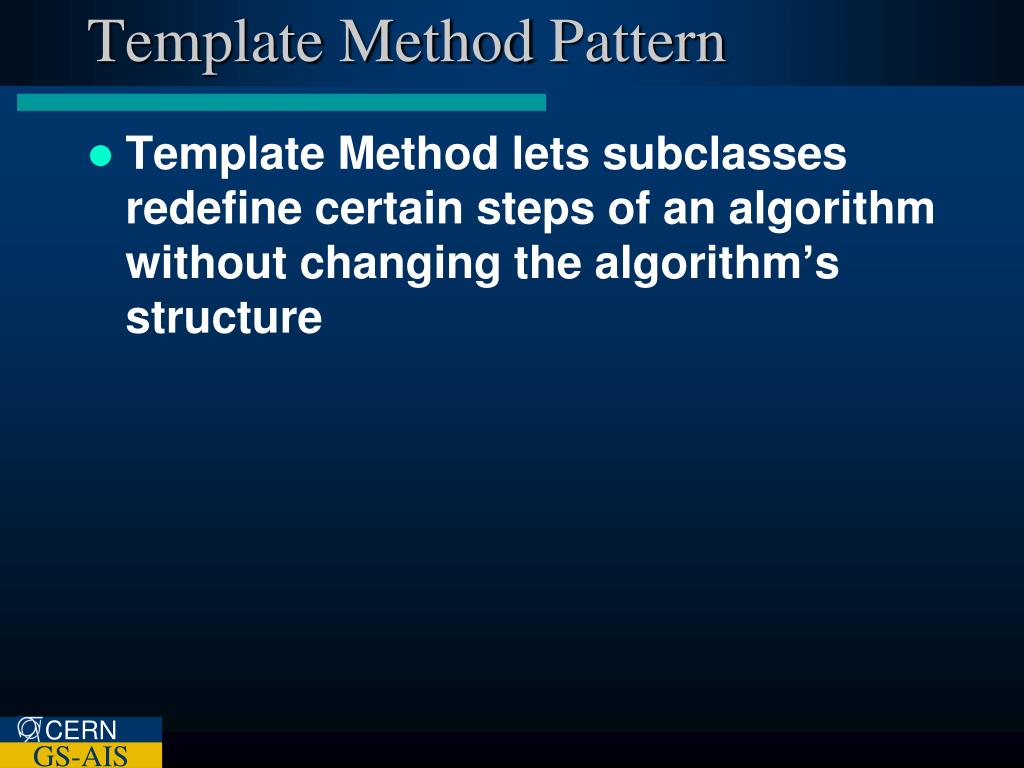 Template Method Pattern • Template Method lets subclasses redefine certain steps of an algorithm without changing the algorithm’s structure