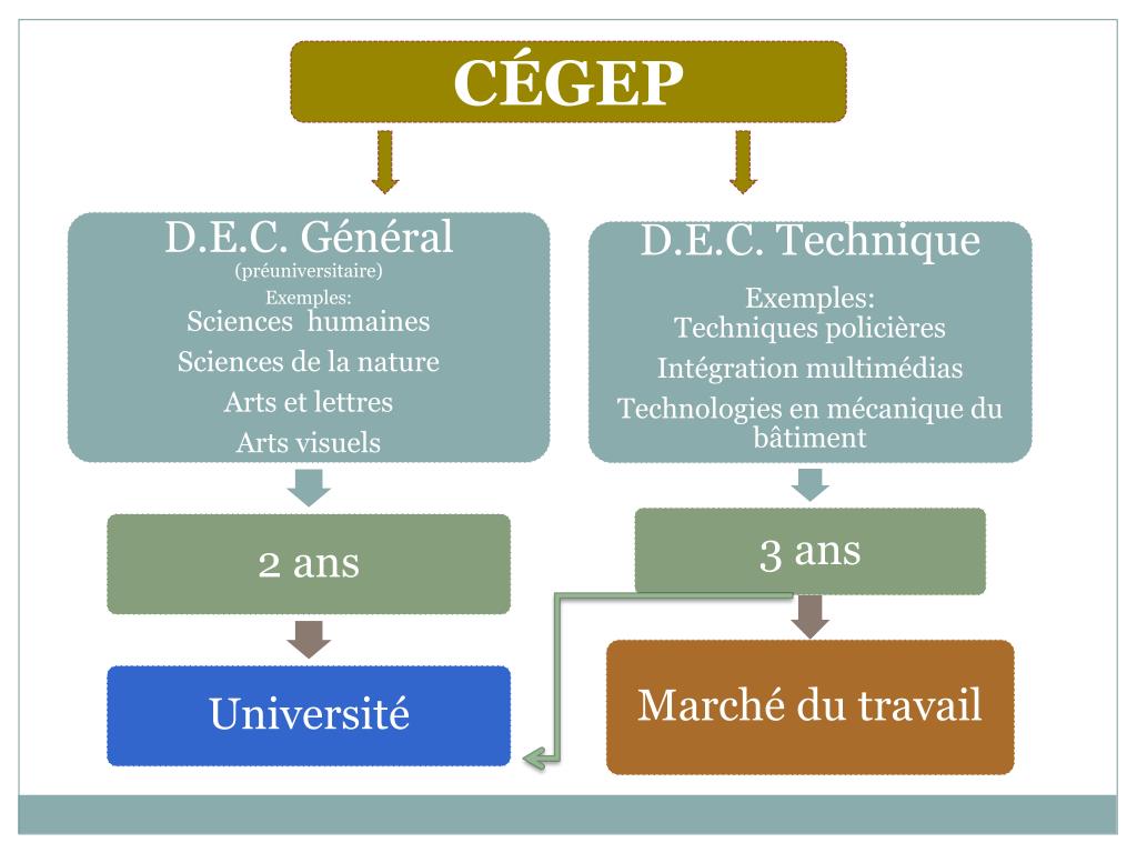 Des possibilitésPasserelles cégep-université ou double-DEC Passerelles DEC–BAC(entente entre un cégep et une université) (3 ans cégep, 2 ans université) Double–DEC (5 ans de cégep, 2 diplômes préuniversitaires) Sciences de la nature et Musique Sciences de la nature et Sciences humaines Musique et Dance Sciences humaines et Dance Arts et Lettres et Arts plastiques Etc.