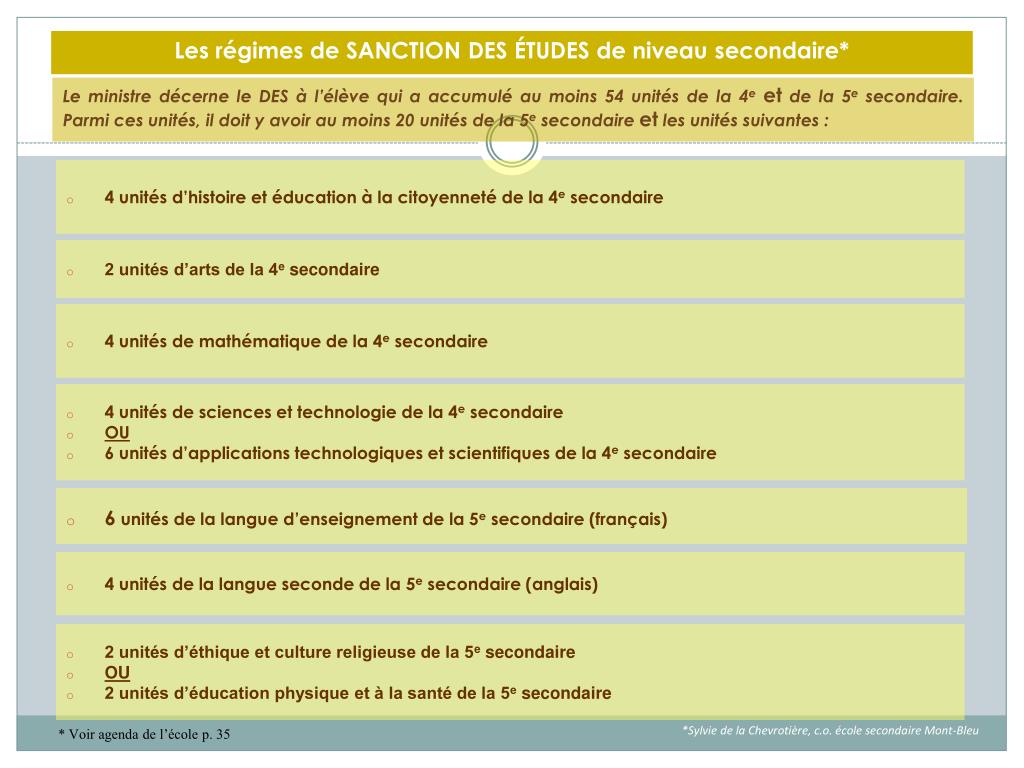 Les régimes de SANCTION DES ÉTUDES de niveau secondaire* Le ministre décerne le DES à l’élève qui a accumulé au moins 54 unités de la 4eet de la 5e secondaire. Parmi ces unités, il doit y avoir au moins 20 unités de la 5e secondaire et les unités suivantes : • 2 unités d’arts de la 4e secondaire • 4 unités d’histoire et éducation à la citoyenneté de la 4e secondaire • 4 unités de mathématique de la 4e secondaire • 4 unités de sciences et technologie de la 4e secondaire • OU • 6 unités d’applications technologiques et scientifiques de la 4e secondaire • 6 unités de la langue d’enseignement de la 5e secondaire (français) • 4 unités de la langue seconde de la 5e secondaire (anglais) • 2 unités d’éthique et culture religieuse de la 5e secondaire • OU • 2 unités d’éducation physique et à la santé de la 5e secondaire * Voir agenda de l’école p. 35
