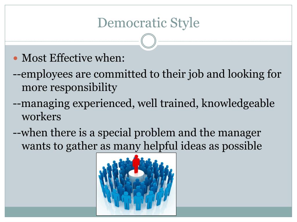 Democratic Style Most Effective when: --employees are committed to their job and looking for more responsibility --managing experienced, well trained, knowledgeable workers --when there is a special problem and the manager wants to gather as many helpful ideas as possible