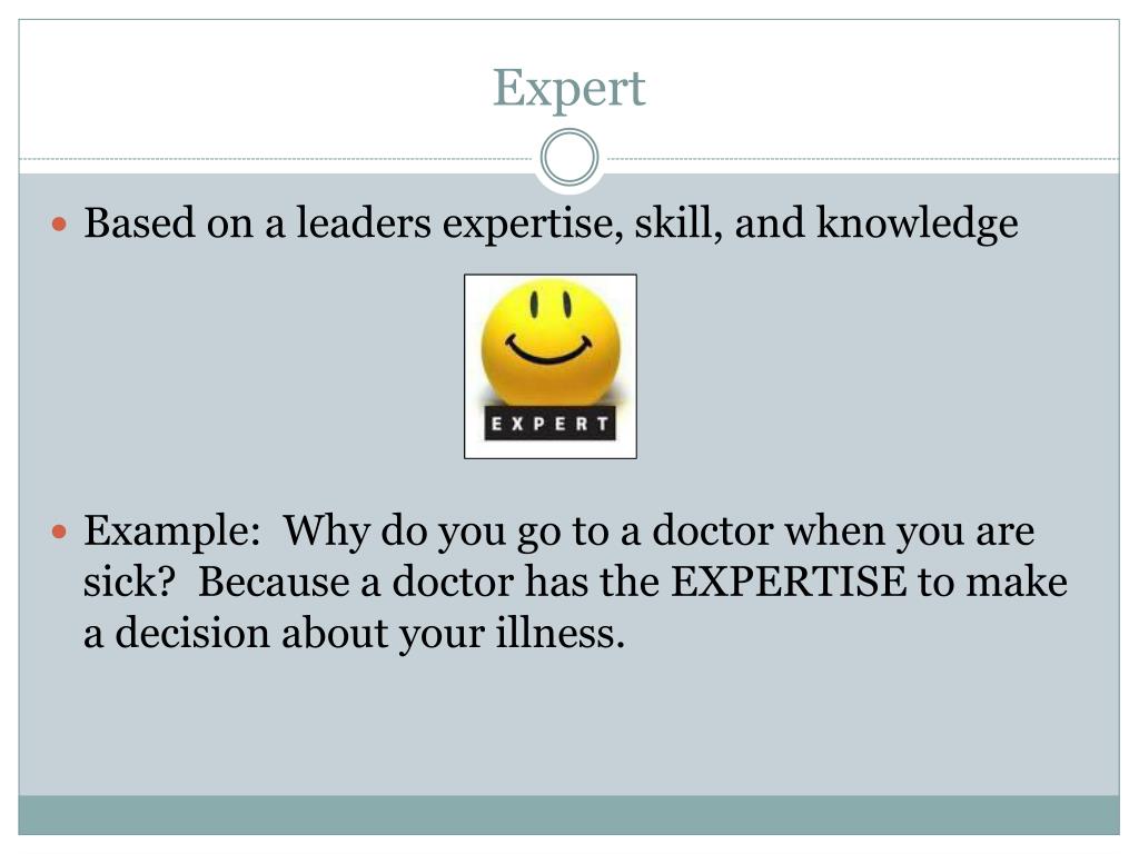 Expert Based on a leaders expertise, skill, and knowledge Example: Why do you go to a doctor when you are sick? Because a doctor has the EXPERTISE to make a decision about your illness.