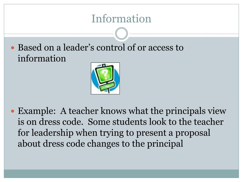 Information Based on a leader’s control of or access to information Example: A teacher knows what the principals view is on dress code. Some students look to the teacher for leadership when trying to present a proposal about dress code changes to the principal