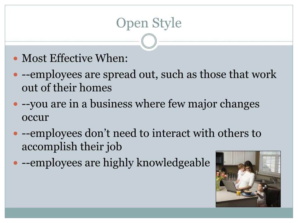 Open Style Most Effective When: --employees are spread out, such as those that work out of their homes --you are in a business where few major changes occur --employees don’t need to interact with others to accomplish their job --employees are highly knowledgeable