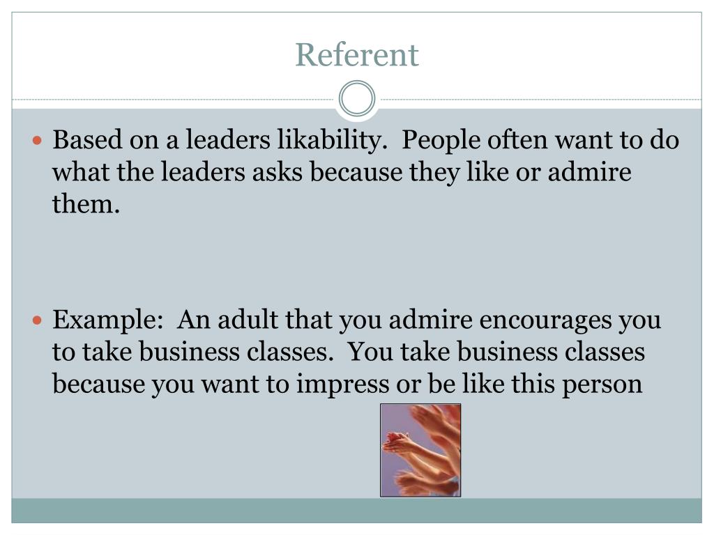 Referent Based on a leaders likability. People often want to do what the leaders asks because they like or admire them. Example: An adult that you admire encourages you to take business classes. You take business classes because you want to impress or be like this person