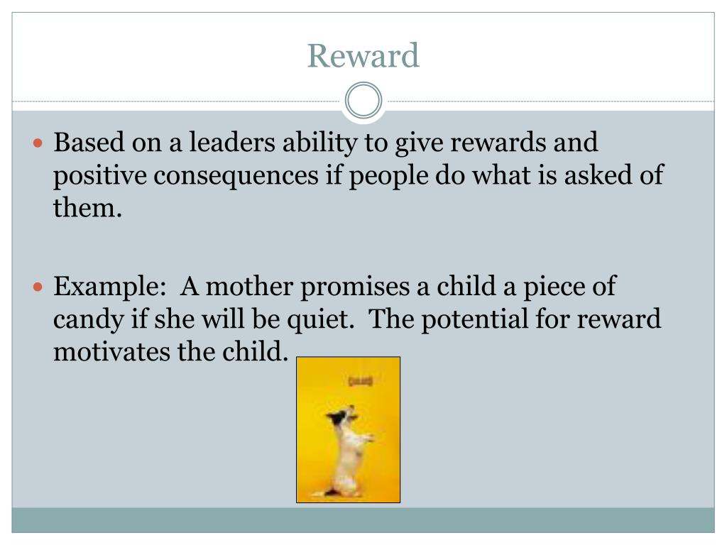 Reward Based on a leaders ability to give rewards and positive consequences if people do what is asked of them. Example: A mother promises a child a piece of candy if she will be quiet. The potential for reward motivates the child.