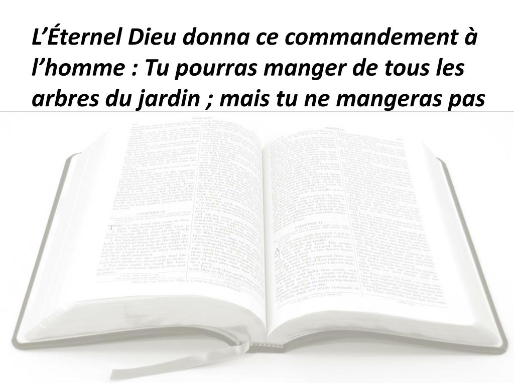 L’Éternel Dieu donna ce commandement à l’homme : Tu pourras manger de tous les arbres du jardin ; mais tu ne mangeras pas de l’arbre de la connaissance du bien et du mal, car le jour où tu en mangeras, tu mourras. Genèse 2.16-17