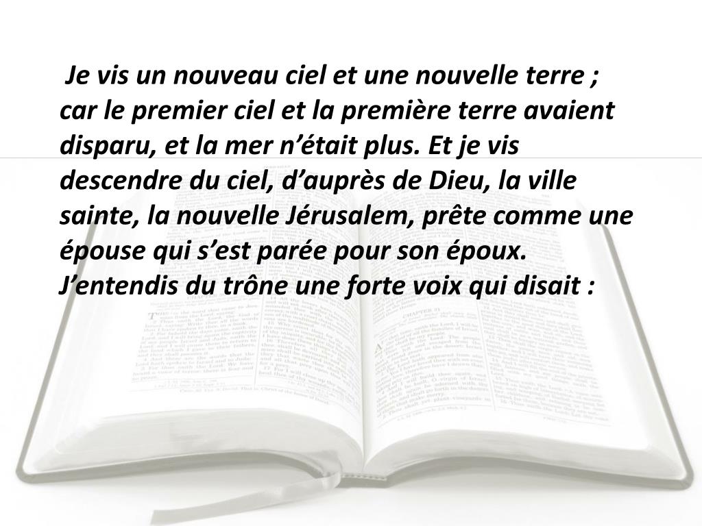 Je vis un nouveau ciel et une nouvelle terre ; car le premier ciel et la première terre avaient disparu, et la mer n’était plus. Et je vis descendre du ciel, d’auprès de Dieu, la ville sainte, la nouvelle Jérusalem, prête comme une épouse qui s’est parée pour son époux. J’entendis du trône une forte voix qui disait :