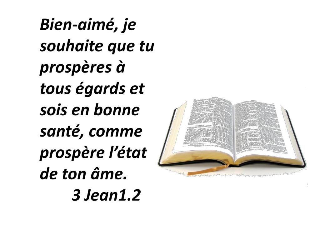 Bien-aimé, je souhaite que tu prospères à tous égards et sois en bonne santé, comme prospère l’état de ton âme. 3 Jean1.2