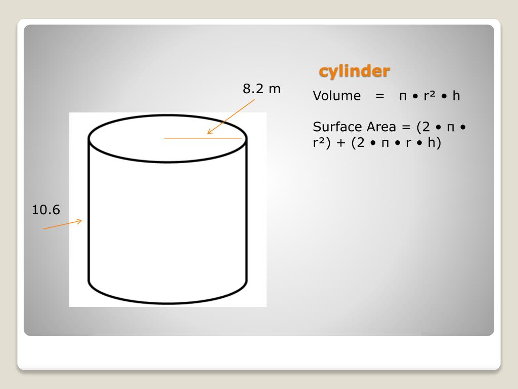 Rectangular prism. 10 in. V = l w h Sa=2lw+2lh+2wh. 12 in. 8 in. Rectangular pyramid. 12. V= 1/3 Bh Sa= ½ lp + B. 10. 7. 7 in. cylinder. 8.2 m. Volume = π • r² • h Surface Area = (2 • π • r²) + (2 • π • r • h). 10.6. Cone. V = ∏r2h S.A.= ∏rl + ∏r2. 8. 7. 6 m. 1.