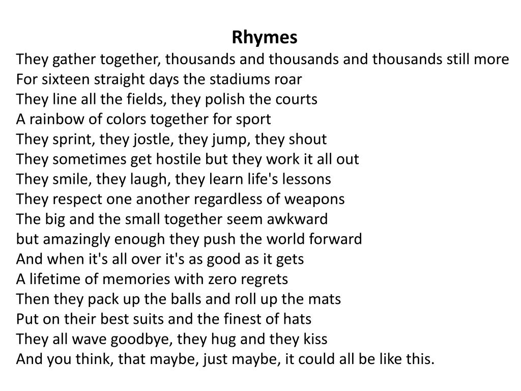 Rhymes They gather together, thousands and thousands and thousands still moreFor sixteen straight days the stadiums roarThey line all the fields, they polish the courtsA rainbow of colors together for sportThey sprint, they jostle, they jump, they shoutThey sometimes get hostile but they work it all outThey smile, they laugh, they learn life's lessonsThey respect one another regardless of weaponsThe big and the small together seem awkwardbut amazingly enough they push the world forwardAnd when it's all over it's as good as it getsA lifetime of memories with zero regretsThen they pack up the balls and roll up the matsPut on their best suits and the finest of hatsThey all wave goodbye, they hug and they kissAnd you think, that maybe, just maybe, it could all be like this.