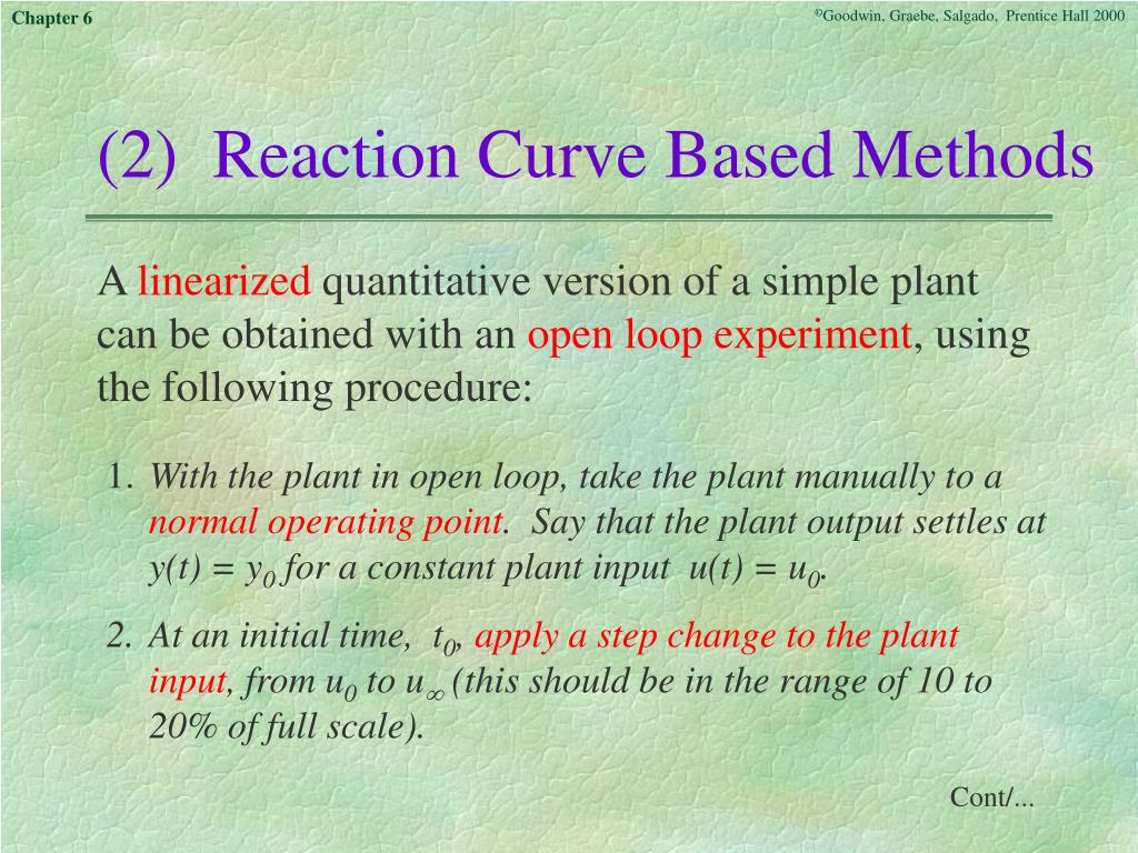 (2) Reaction Curve Based Methods A linearized quantitative version of a simple plant can be obtained with an open loop experiment, using the following procedure: 1. With the plant in open loop, take the plant manually to a normal operating point. Say that the plant output settles at y(t) = y0 for a constant plant input u(t) = u0. 2. At an initial time, t0, apply a step change to the plant input, from u0 to u (this should be in the range of 10 to 20% of full scale). Cont/...