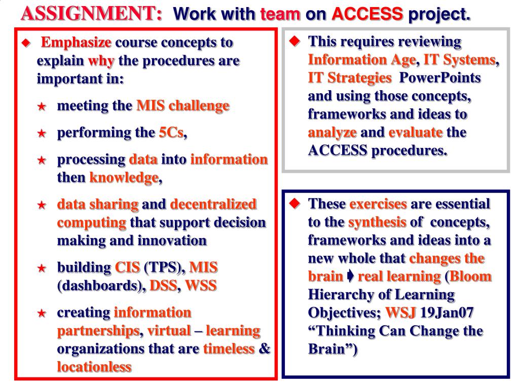 ASSIGNMENT: Work with team on ACCESS project. • This requires reviewing Information Age, IT Systems, IT StrategiesPowerPoints and using those concepts, frameworks and ideas to analyze and evaluate the ACCESS procedures. • Emphasize course concepts to explain why the procedures are important in: • meeting the MIS challenge • performing the 5Cs, • processing data into information then knowledge, • data sharing and decentralized computing that support decision making and innovation • building CIS (TPS), MIS (dashboards), DSS, WSS • creating informationpartnerships, virtual – learning organizations that are timeless & locationless • These exercises are essential to the synthesis of concepts, frameworks and ideas into a new whole that changes the brain reallearning(Bloom Hierarchy of Learning Objectives; WSJ 19Jan07 “Thinking Can Change the Brain”)