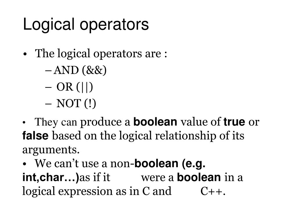 Logical operators • The logical operators are : • AND (&&) • OR (||) • NOT (!) • They can produce a boolean value of true or false based on the logical relationship of its arguments. • We can’t use a non-boolean (e.g. int,char…)as if it were a boolean in a logical expression as in C and C++.