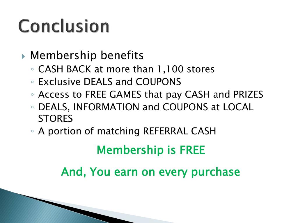 Conclusion • Membership benefits • CASH BACK at more than 1,100 stores • Exclusive DEALS and COUPONS • Access to FREE GAMES that pay CASH and PRIZES • DEALS, INFORMATION and COUPONS at LOCAL STORES • A portion of matching REFERRAL CASH Membership is FREE And, You earn on every purchase