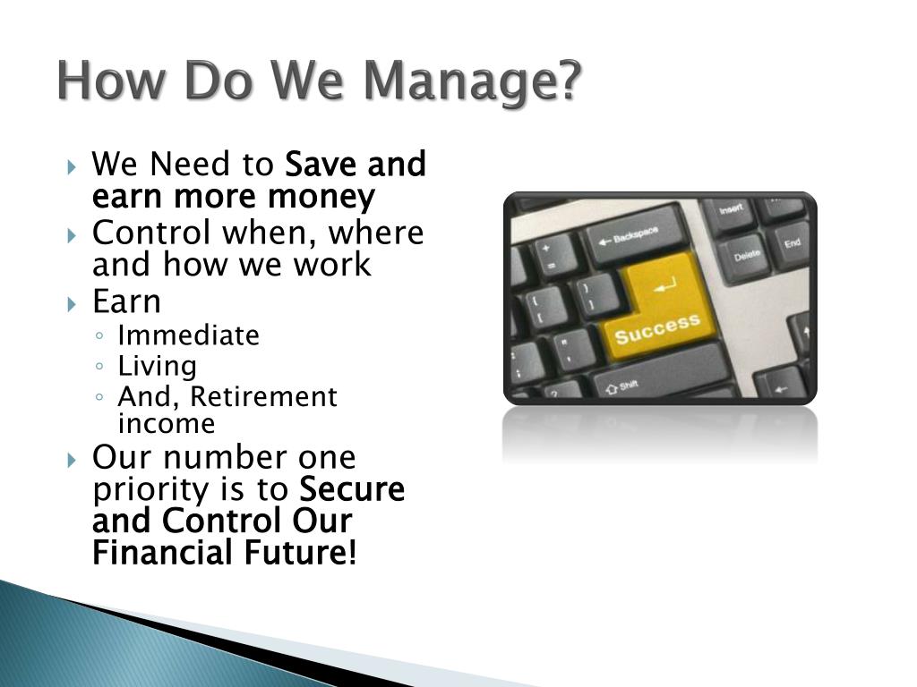 How Do We Manage? • We Need to Save and earn more money • Control when, where and how we work • Earn • Immediate • Living • And, Retirement income • Our number one priority is to Secure and Control Our Financial Future!