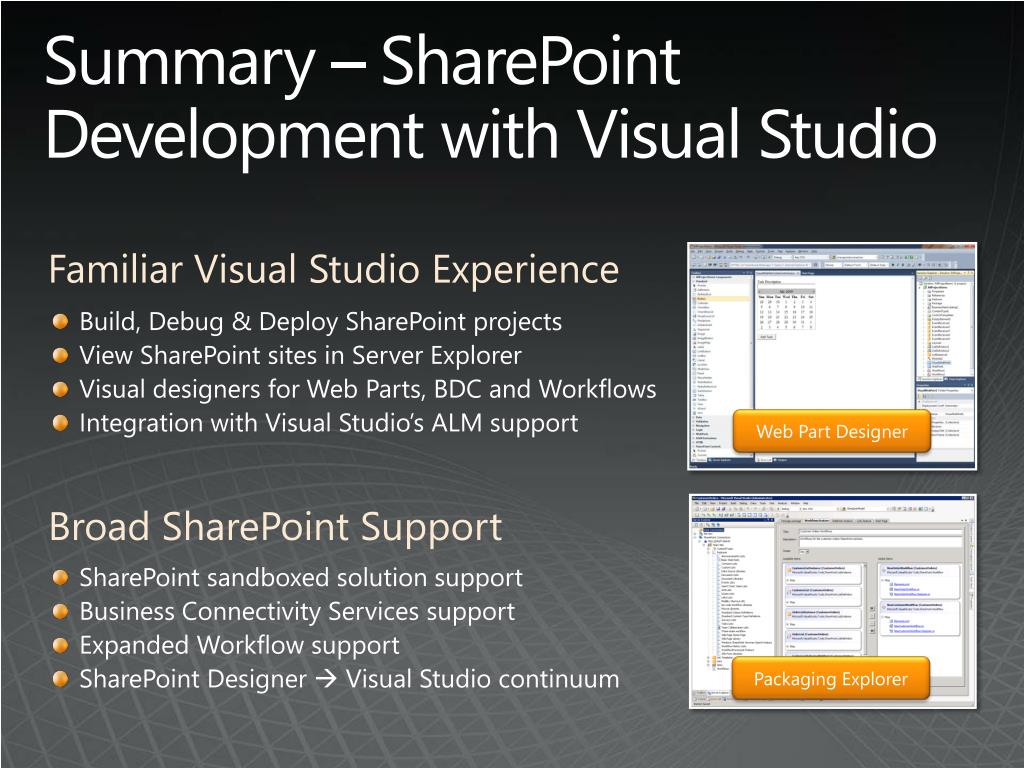 Summary – SharePoint Development with Visual Studio Familiar Visual Studio Experience • Build, Debug & Deploy SharePoint projects • View SharePoint sites in Server Explorer • Visual designers for Web Parts, BDC and Workflows • Integration with Visual Studio’s ALM support Web Part Designer Broad SharePoint Support • SharePoint sandboxed solution support • Business Connectivity Services support • Expanded Workflow support • SharePoint Designer Visual Studio continuum Packaging Explorer