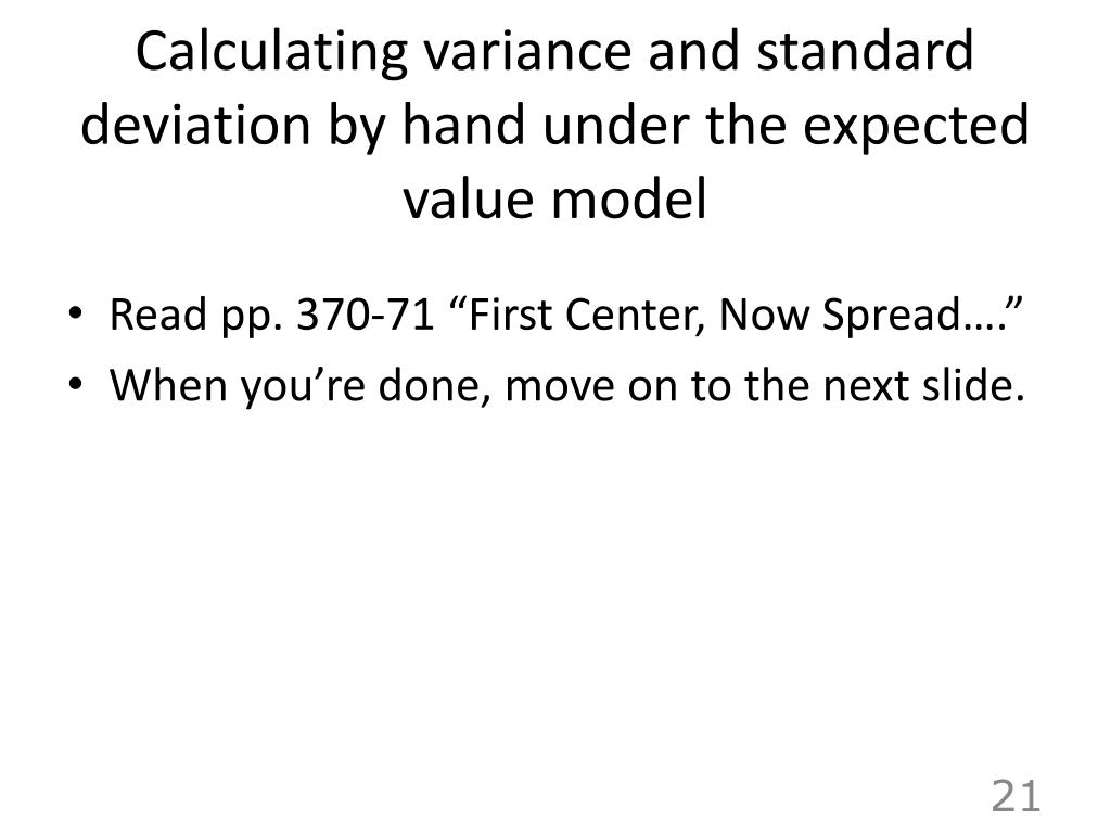 Calculating variance and standard deviation by hand under the expected value model • Read pp. 370-71 “First Center, Now Spread….” • When you’re done, move on to the next slide.