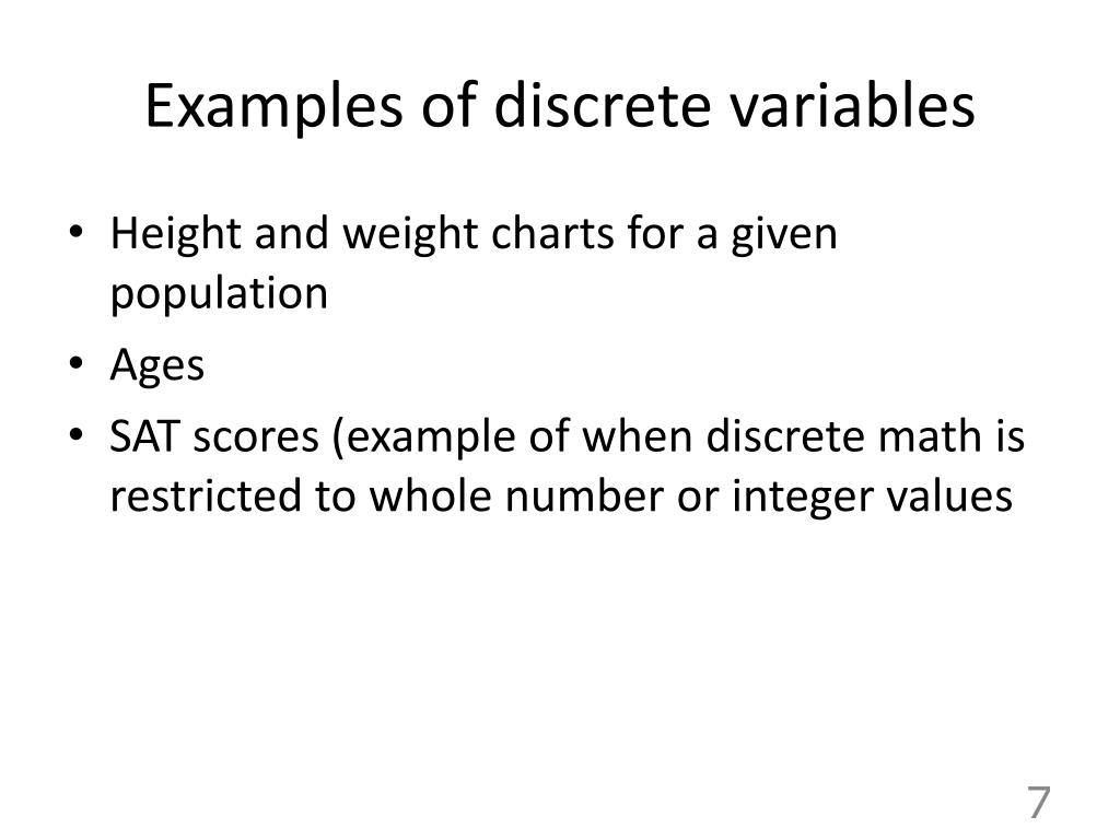 Examples of discrete variables • Height and weight charts for a given population • Ages • SAT scores (example of when discrete math is restricted to whole number or integer values