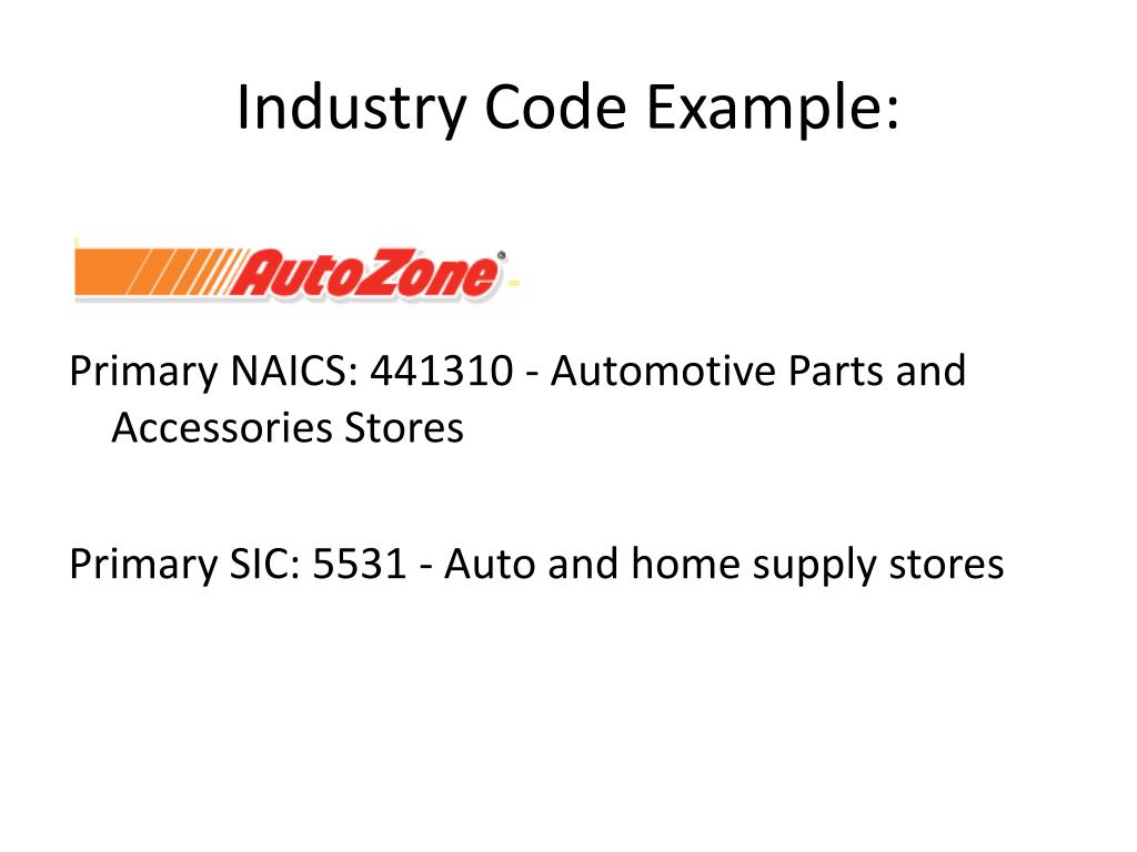 Industry Code Example: Primary NAICS: 441310 - Automotive Parts and Accessories Stores Primary SIC: 5531 - Auto and home supply stores