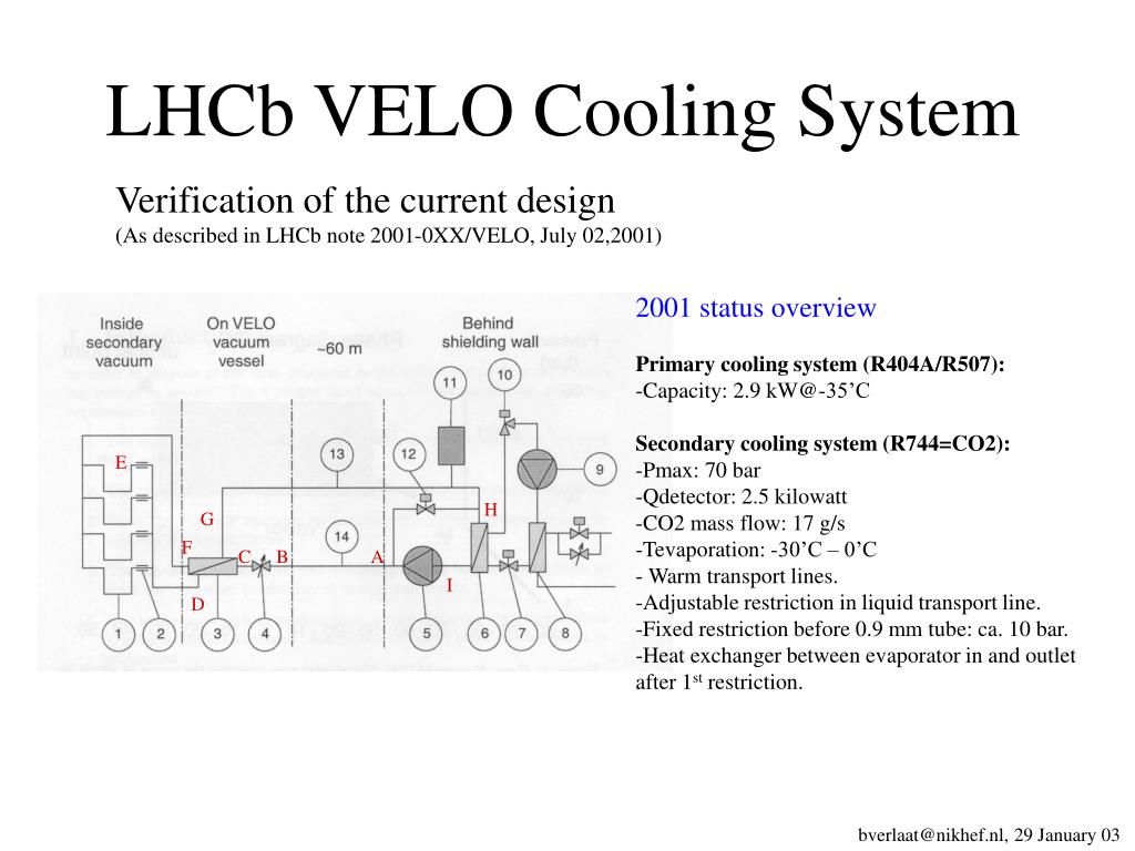 LHCb VELO Meeting. LHCb VELO Cooling System Bart Verlaat (NIKHEF) 25 February 2003. LHCb VELO Cooling System . Verification of the current design (As described in LHCb note 2001-0XX/VELO, July 02,2001). 2001 status overview Primary cooling system (R404A/R507): Capacity: 2.9 kW@-35’C