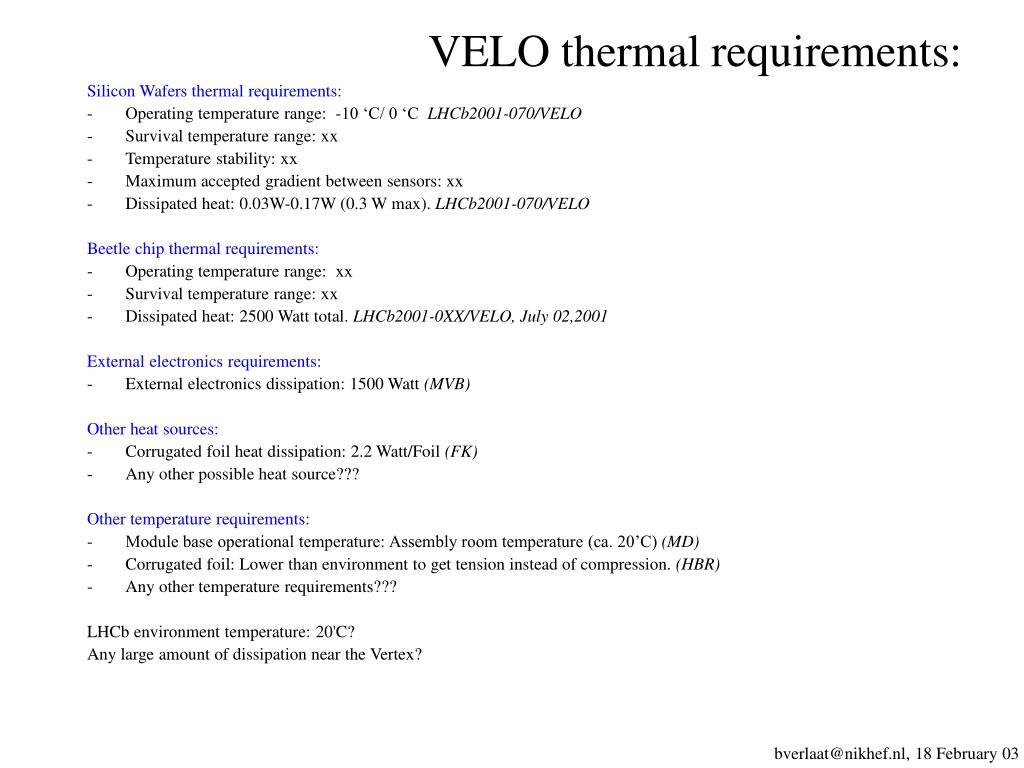 VELO thermal requirements: Silicon Wafers thermal requirements: • Operating temperature range: -10 ‘C/ 0 ‘C LHCb2001-070/VELO • Survival temperature range: xx • Temperature stability: xx • Maximum accepted gradient between sensors: xx • Dissipated heat: 0.03W-0.17W (0.3 W max). LHCb2001-070/VELO Beetle chip thermal requirements: • Operating temperature range: xx • Survival temperature range: xx • Dissipated heat: 2500 Watt total. LHCb2001-0XX/VELO, July 02,2001 External electronics requirements: • External electronics dissipation: 1500 Watt (MVB) Other heat sources: • Corrugated foil heat dissipation: 2.2 Watt/Foil (FK) • Any other possible heat source??? Other temperature requirements: • Module base operational temperature: Assembly room temperature (ca. 20’C) (MD) • Corrugated foil: Lower than environment to get tension instead of compression. (HBR) • Any other temperature requirements??? LHCb environment temperature: 20'C? Any large amount of dissipation near the Vertex? bverlaat@nikhef.nl, 18 February 03