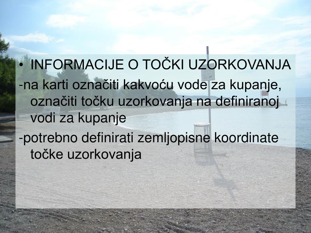 INFORMACIJE O TOČKI UZORKOVANJA -na karti označiti kakvoću vode za kupanje, označiti točku uzorkovanja na definiranoj vodi za kupanje -potrebno definirati zemljopisne koordinate točke uzorkovanja