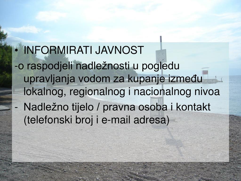 INFORMIRATI JAVNOST -o raspodjeli nadležnosti u pogledu upravljanja vodom za kupanje između lokalnog, regionalnog i nacionalnog nivoa • Nadležno tijelo / pravna osoba i kontakt (telefonski broj i e-mail adresa)