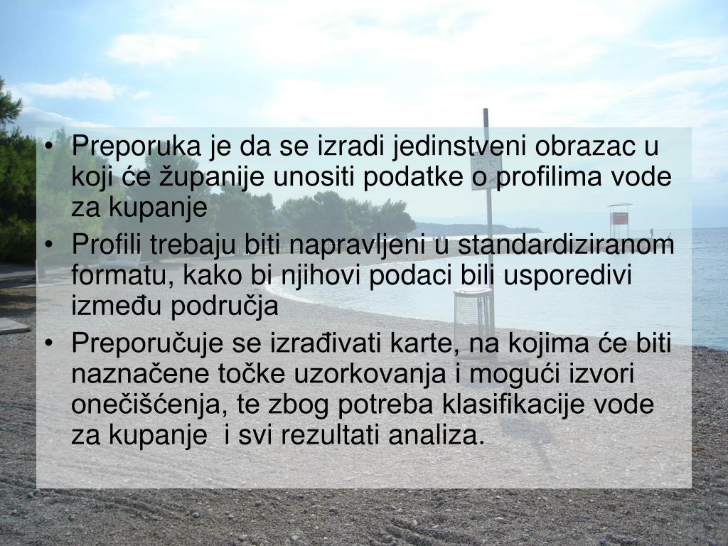 Preporuka je da se izradi jedinstveni obrazac u koji će županije unositi podatke o profilima vode za kupanje • Profili trebaju biti napravljeni u standardiziranom formatu, kako bi njihovi podaci bili usporedivi između područja • Preporučuje se izrađivati karte, na kojima će biti naznačene točke uzorkovanja i mogući izvori onečišćenja, te zbog potreba klasifikacije vode za kupanje i svi rezultati analiza.