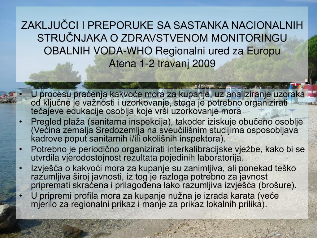 ZAKLJUČCI I PREPORUKE SA SASTANKA NACIONALNIH STRUČNJAKA O ZDRAVSTVENOM MONITORINGU OBALNIH VODA-WHO Regionalni ured za EuropuAtena 1-2 travanj 2009 • U procesu praćenja kakvoće mora za kupanje, uz analiziranje uzoraka od ključne je važnosti i uzorkovanje, stoga je potrebno organizirati tečajeve edukacije osoblja koje vrši uzorkovanje mora • Pregled plaža (sanitarna inspekcija), također iziskuje obučeno osoblje (Većina zemalja Sredozemlja na sveučilišnim studijima osposobljava kadrove poput sanitarnih i/ili okolišnih inspektora). • Potrebno je periodično organizirati interkalibracijske vježbe, kako bi se utvrdila vjerodostojnost rezultata pojedinih laboratorija. • Izvješća o kakvoći mora za kupanje su zanimljiva, ali ponekad teško razumljiva široj javnosti, iz tog je razloga potrebno za javnost pripremati skraćena i prilagođena lako razumljiva izvješća (brošure). • U pripremi profila mora za kupanje nužna je izrada karata (veće mjerilo za regionalni prikaz i manje za prikaz lokalnih prilika).