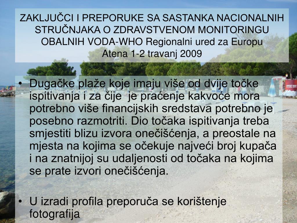 ZAKLJUČCI I PREPORUKE SA SASTANKA NACIONALNIH STRUČNJAKA O ZDRAVSTVENOM MONITORINGU OBALNIH VODA-WHO Regionalni ured za EuropuAtena 1-2 travanj 2009 • Dugačke plaže koje imaju više od dvije točke ispitivanja i za čije je praćenje kakvoće mora potrebno više financijskih sredstava potrebno je posebno razmotriti. Dio točaka ispitivanja treba smjestiti blizu izvora onečišćenja, a preostale na mjesta na kojima se očekuje najveći broj kupača i na znatnijoj su udaljenosti od točaka na kojima se prate izvori onečišćenja. • U izradi profila preporuča se korištenje fotografija