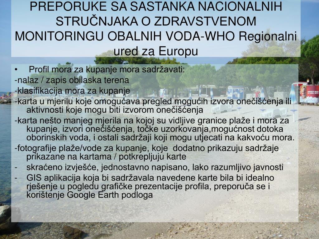 PREPORUKE SA SASTANKA NACIONALNIH STRUČNJAKA O ZDRAVSTVENOM MONITORINGU OBALNIH VODA-WHO Regionalni ured za Europu • Profil mora za kupanje mora sadržavati: -nalaz / zapis obilaska terena -klasifikacija mora za kupanje -karta u mjerilu koje omogućava pregled mogućih izvora onečišćenja ili aktivnosti koje mogu biti izvorom onečišćenja -karta nešto manjeg mjerila na kojoj su vidljive granice plaže i mora za kupanje, izvori onečišćenja, točke uzorkovanja,mogućnost dotoka oborinskih voda, i ostali sadržaji koji mogu utjecati na kakvoću mora. -fotografije plaže/vode za kupanje, koje dodatno prikazuju sadržaje prikazane na kartama / potkrepljuju karte • skraćeno izvješće, jednostavno napisano, lako razumljivo javnosti • GIS aplikacija koja bi sadržavala navedene karte bila bi idealno rješenje u pogledu grafičke prezentacije profila, preporuča se i korištenje Google Earth podloga