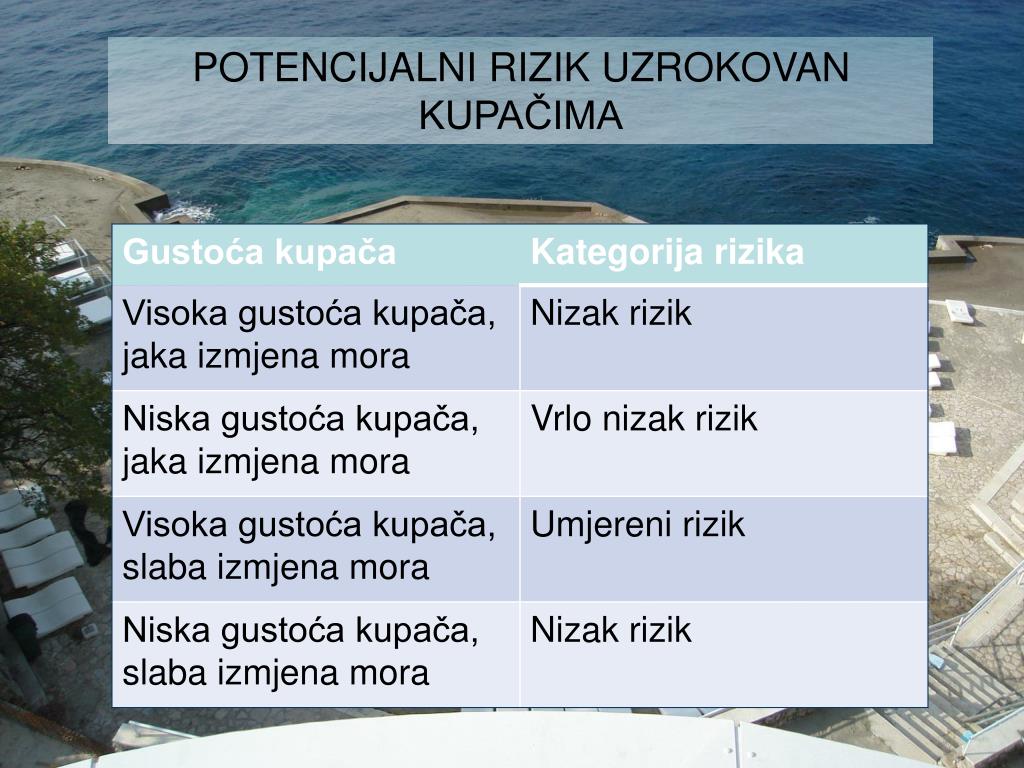 C.GUSTOĆA KUPAČA (bather shedding) Gustoća kupača u sezoni kupanja (procjena ovisno o osobinama plaže) Cirkulacija / izmjena mora u području plaže