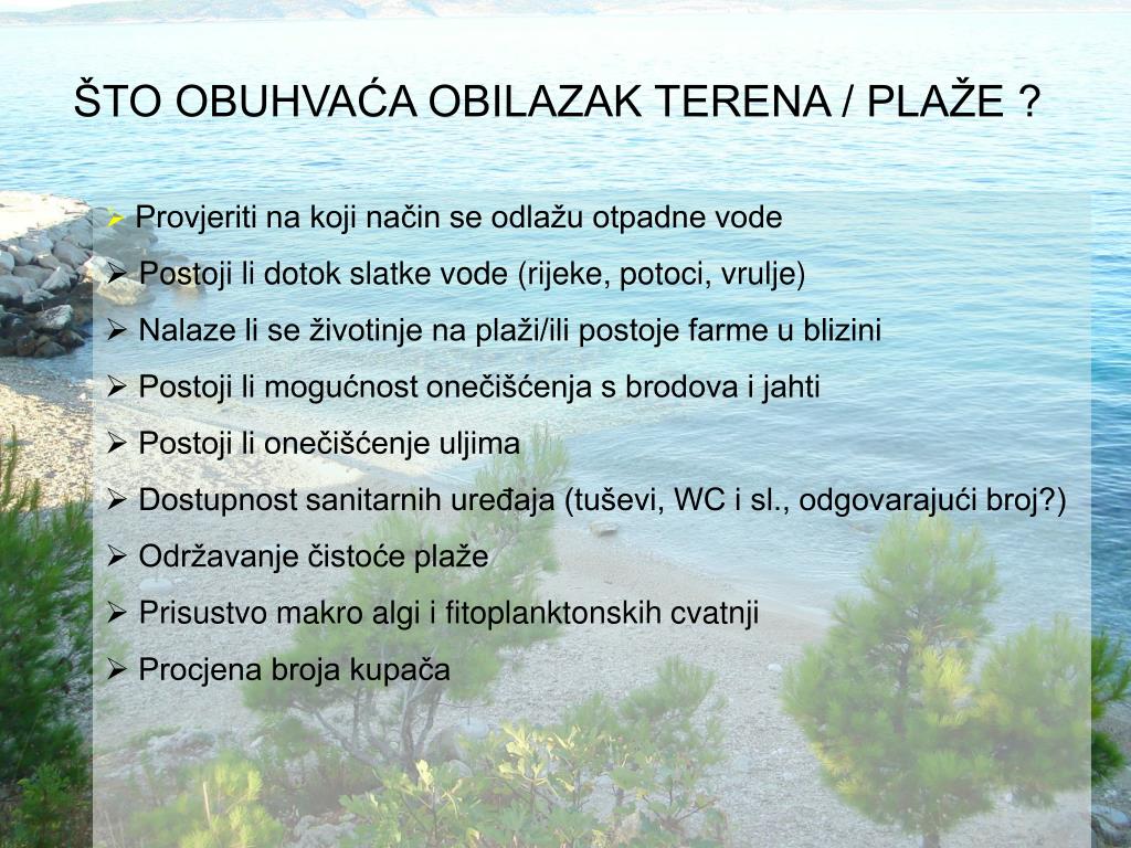 Provjeriti na koji način se odlažu otpadne vode • Postoji li dotok slatke vode (rijeke, potoci, vrulje) • Nalaze li se životinje na plaži/ili postoje farme u blizini • Postoji li mogućnost onečišćenja s brodova i jahti • Postoji li onečišćenje uljima • Dostupnost sanitarnih uređaja (tuševi, WC i sl., odgovarajući broj?) • Održavanje čistoće plaže • Prisustvo makro algi i fitoplanktonskih cvatnji • Procjena broja kupača ŠTO OBUHVAĆA OBILAZAK TERENA / PLAŽE ?