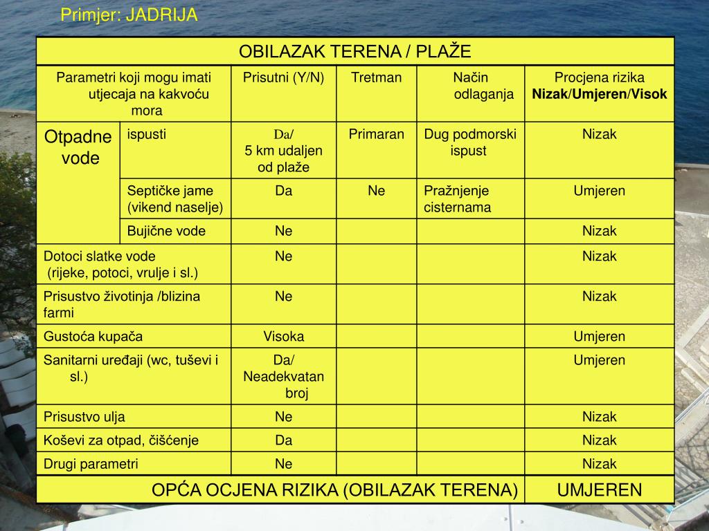 PROFIL MORA ZA KUPANJE (Članak 9) • profil mora za kupanje sadrži: – točke uzorkovanja, – opis fizikalnih, geografskih i hidroloških karakteristika mora za kupanje, – ocjenu kakvoće mora za kupanje, – utvrđivanje i procjenu izvora onečišćenja koji mogu utjecati na more za kupanje i zdravlje kupača,– utvrđivanje stupnja rizika onečišćenja, – procjenu moguće proliferacije makroalgi i/ili fitoplanktona i– sustav obavješćivanja javnosti.