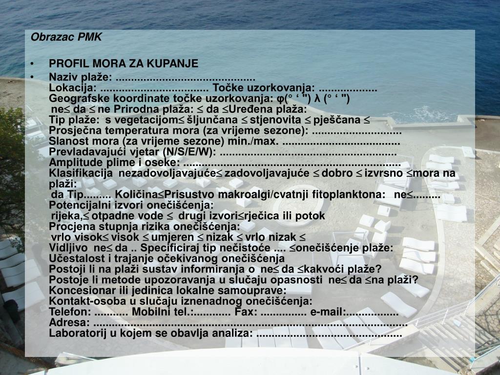 Obrazac PMK • PROFIL MORA ZA KUPANJE • Naziv plaže: .............................................Lokacija: ................................... Točke uzorkovanja: ...................Geografske koordinate točke uzorkovanja: φ(° ‘ ") λ (° ‘ ") ne da ne Prirodna plaža: da Uređena plaža: Tip plaže: s vegetacijomšljunčana stjenovita pješčana Prosječna temperatura mora (za vrijeme sezone): .............................Slanost mora (za vrijeme sezone) min./max. ......................................Prevladavajući vjetar (N/S/E/W): .........................................................Amplitude plime i oseke: ......................................................................Klasifikacija nezadovoljavajućezadovoljavajuće dobro izvrsno mora na plaži: da Tip......... KoličinaPrisustvo makroalgi/cvatnji fitoplanktona: ne.........Potencijalni izvori onečišćenja: rijeka,otpadne vode drugi izvorirječica ili potok Procjena stupnja rizika onečišćenja: vrlo visokvisok umjeren nizak vrlo nizak Vidljivo neda .. Specificiraj tip nečistoće .... onečišćenje plaže:Učestalost i trajanje očekivanog onečišćenjaPostoji li na plaži sustav informiranja o neda kakvoći plaže?Postoje li metode upozoravanja u slučaju opasnosti neda na plaži?Koncesionar ili jedinica lokalne samouprave:Kontakt-osoba u slučaju iznenadnog onečišćenja:Telefon: ........... Mobilni tel.:............ Fax: ............... e-mail:.................Adresa: .....................................................................................................Laboratorij u kojem se obavlja analiza: ...............................................