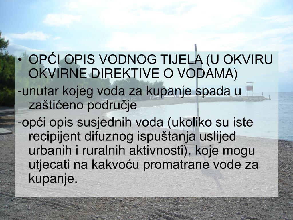 OPĆI OPIS VODNOG TIJELA (U OKVIRU OKVIRNE DIREKTIVE O VODAMA) -unutar kojeg voda za kupanje spada u zaštićeno područje -opći opis susjednih voda (ukoliko su iste recipijent difuznog ispuštanja uslijed urbanih i ruralnih aktivnosti), koje mogu utjecati na kakvoću promatrane vode za kupanje.