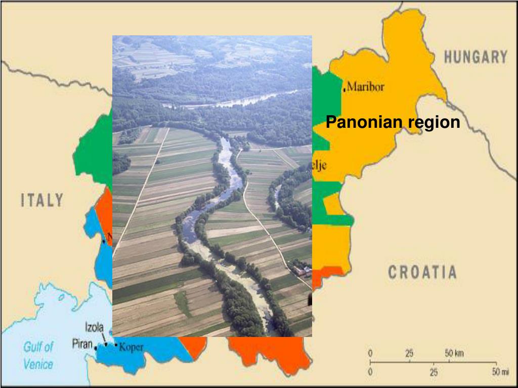 Panonian region • It covers 21.2% of the surface • Most fertile farm land in Slovenia • Typically continental climate • 80 pairs of white storks in the area • Thermal and mineral watersspa resorts • Orchards and vineyards on the hills