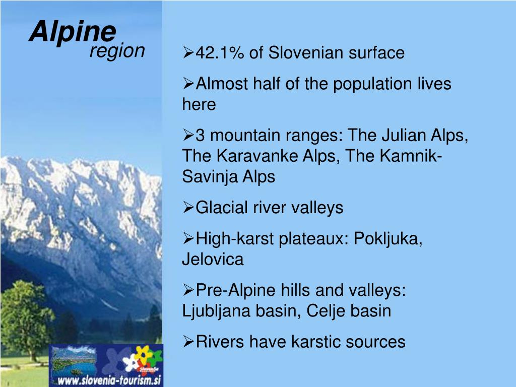 Alpine region • 42.1% of Slovenian surface • Almost half of the population lives here • 3 mountain ranges: The Julian Alps, The Karavanke Alps, The Kamnik-Savinja Alps • Glacial river valleys • High-karst plateaux: Pokljuka, Jelovica • Pre-Alpine hills and valleys: Ljubljana basin, Celje basin • Rivers have karstic sources