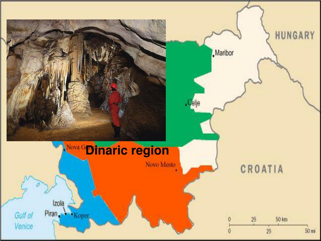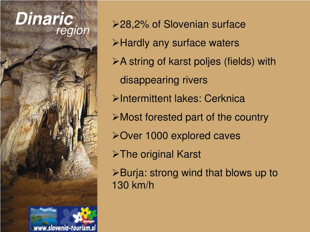 Dinaric • 28,2% of Slovenian surface • Hardly any surface waters • A string of karst poljes (fields) with disappearing rivers • Intermittent lakes: Cerknica • Most forested part of the country • Over 1000 explored caves • The original Karst • Burja: strong wind that blows up to 130 km/h region