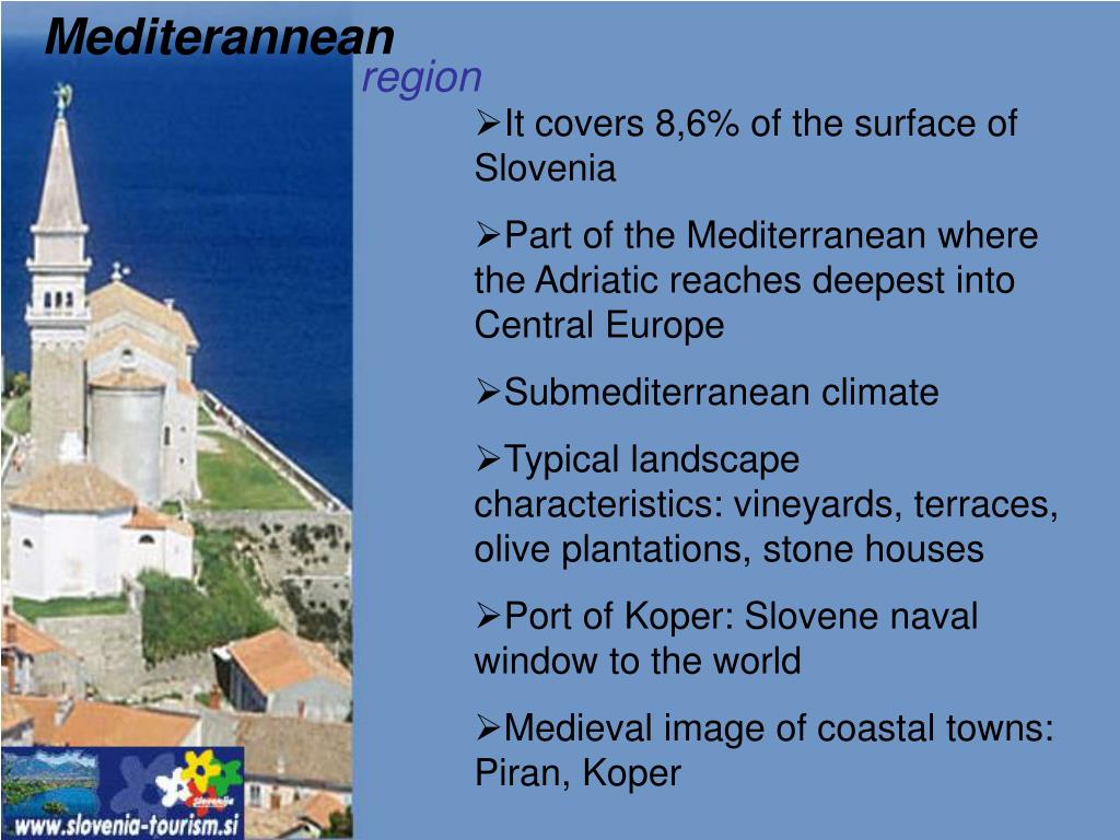 Mediterannean region • It covers 8,6% of the surface of Slovenia • Part of the Mediterranean where the Adriatic reaches deepest into Central Europe • Submediterranean climate • Typical landscape characteristics: vineyards, terraces, olive plantations, stone houses • Port of Koper: Slovene naval window to the world • Medieval image of coastal towns: Piran, Koper