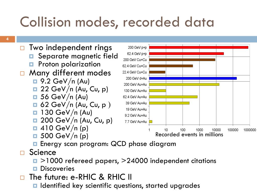 Collision modes, recorded data • Two independent rings • Separate magnetic field • Proton polarization • Many different modes • 9.2 GeV/n (Au) • 22 GeV/n (Au, Cu, p) • 56 GeV/n (Au) • 62 GeV/n (Au, Cu, p) • 130 GeV/n (Au) • 200 GeV/n (Au, Cu, p) • 410 GeV/n (p) • 500 GeV/n (p) • Energyscan program: QCD phase diagram • Science • >1000 refereed papers, >24000 independent citations • Discoveries • The future: e-RHIC & RHIC II • Identified key scientific questions, started upgrades Recorded events in millions