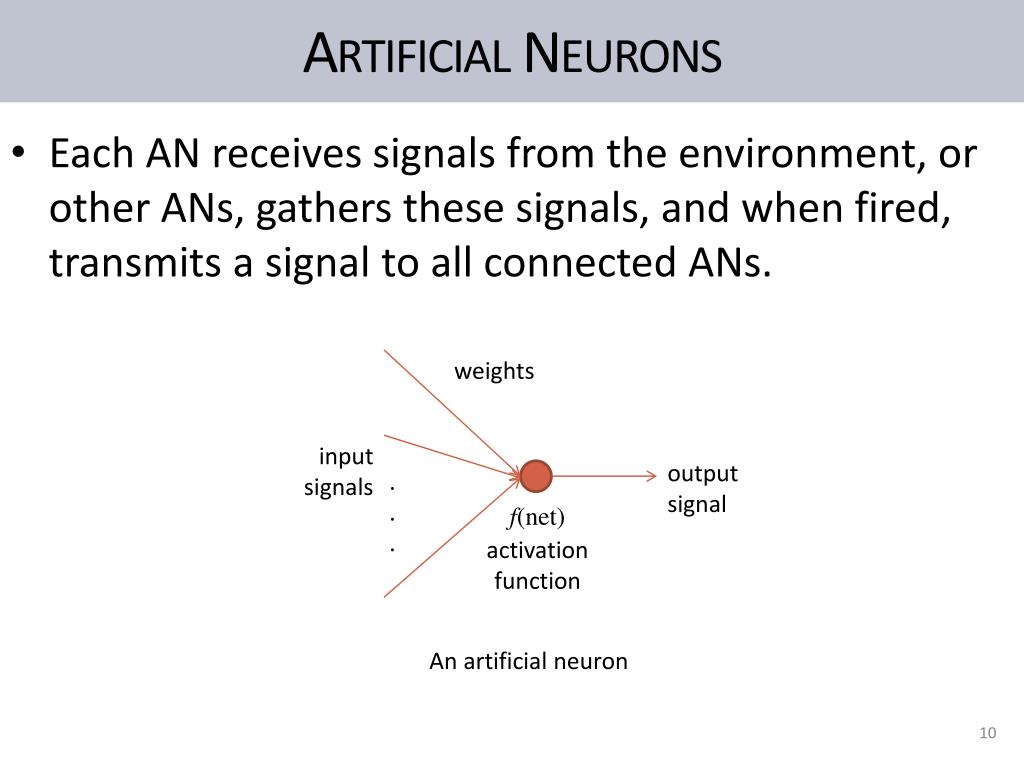 Artificial Neurons • Each AN receives signals from the environment, or other ANs, gathers these signals, and when fired, transmits a signal to all connected ANs. weights input signals output signal . . . f(net) activation function An artificial neuron