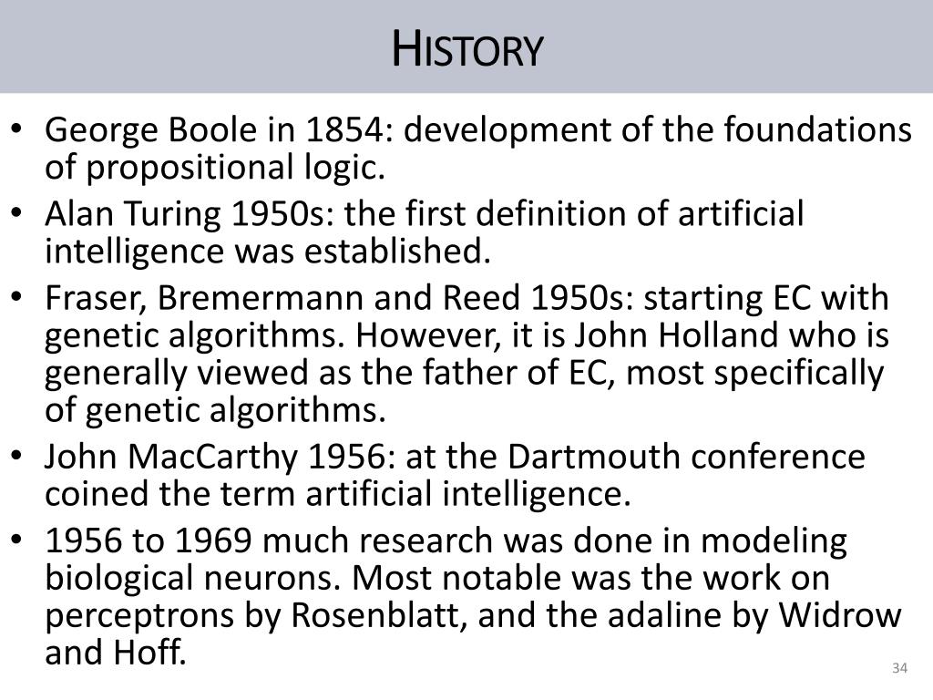 History • George Boole in 1854: development of the foundations of propositional logic. • Alan Turing 1950s: the first definition of artificial intelligence was established. • Fraser, Bremermann and Reed 1950s: starting EC with genetic algorithms. However, it is John Holland who is generally viewed as the father of EC, most specifically of genetic algorithms. • John MacCarthy 1956: at the Dartmouth conference coined the term artificial intelligence. • 1956 to 1969 much research was done in modeling biological neurons. Most notable was the work on perceptrons by Rosenblatt, and the adaline by Widrow and Hoff.
