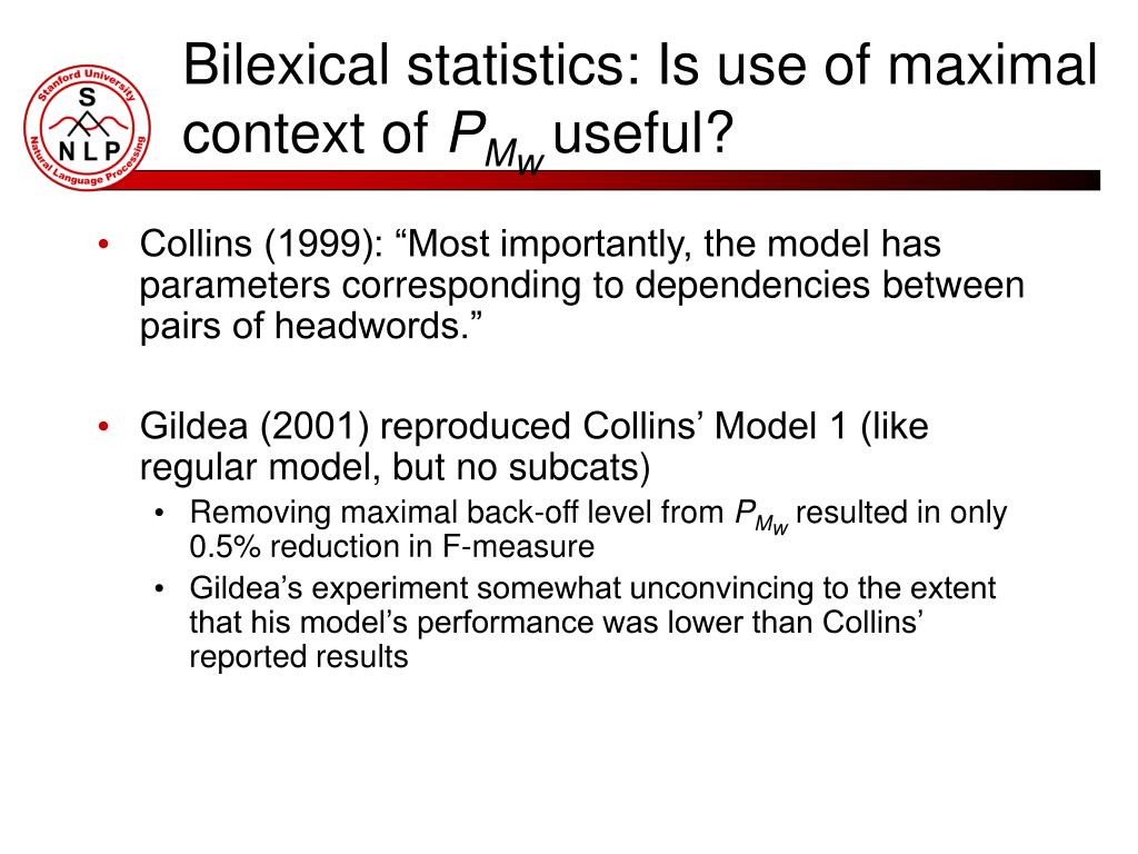 Bilexical statistics: Is use of maximal context of PMw useful? • Collins (1999): “Most importantly, the model has parameters corresponding to dependencies between pairs of headwords.” • Gildea (2001) reproduced Collins’ Model 1 (like regular model, but no subcats) • Removing maximal back-off level from PMw resulted in only 0.5% reduction in F-measure • Gildea’s experiment somewhat unconvincing to the extent that his model’s performance was lower than Collins’ reported results