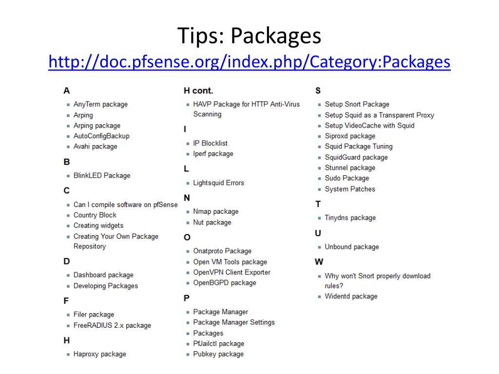 Tips: Packageshttp://doc.pfsense.org/index.php/Category:Packages