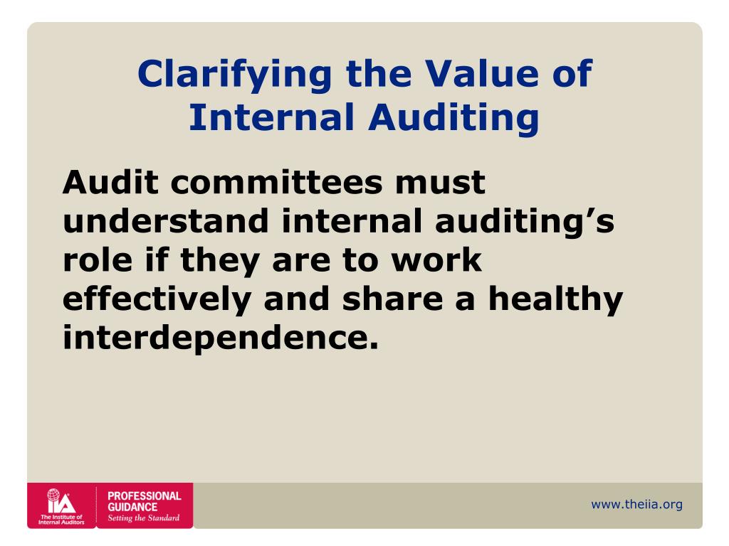 Clarifying the Value of Internal Auditing Audit committees must understand internal auditing’s role if they are to work effectively and share a healthy interdependence.