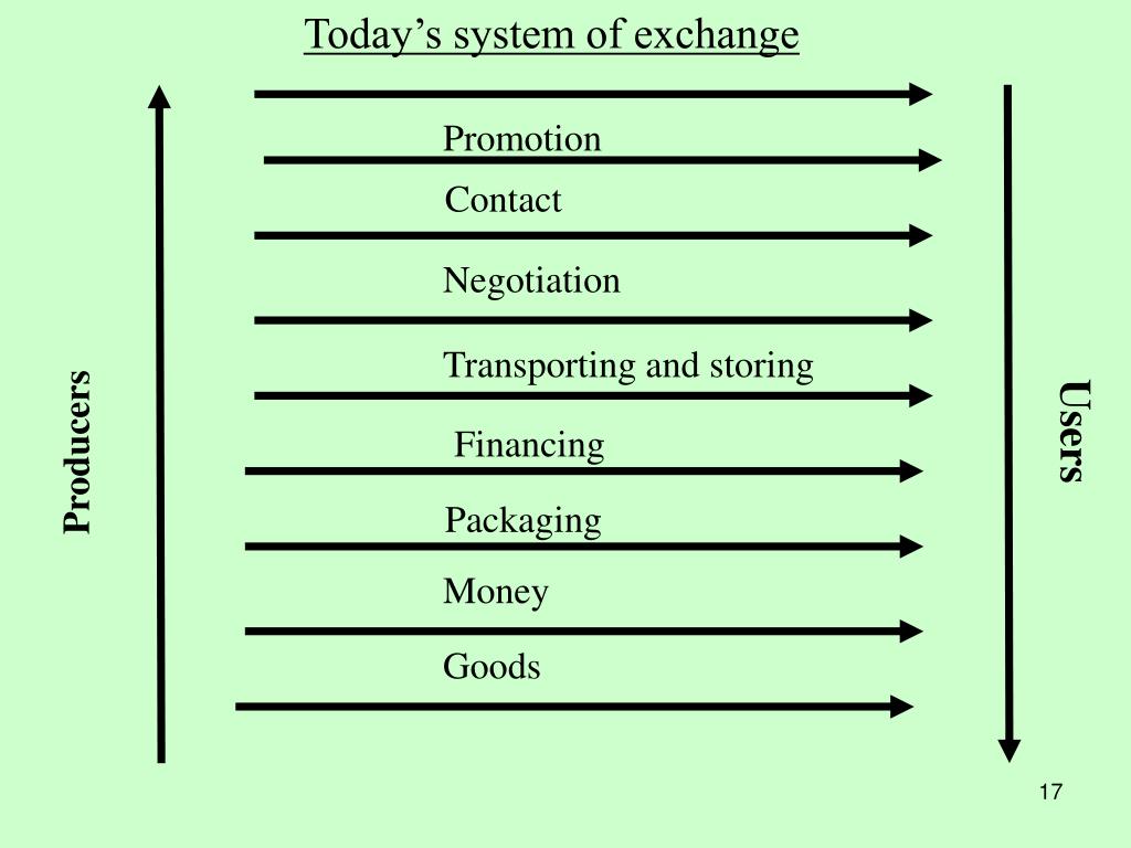 Today’s system of exchange Promotion Contact Negotiation Transporting and storing Users Financing Producers Packaging Money Goods