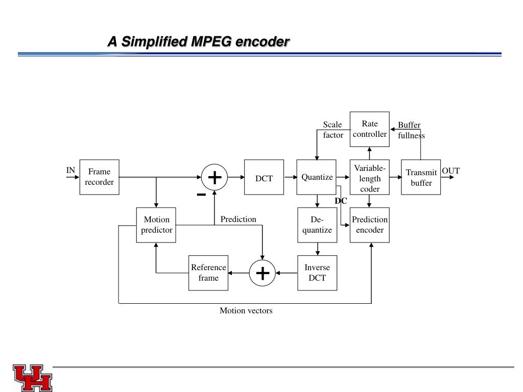 Rate controller Scale factor Buffer fullness Variable-length coder IN OUT Frame recorder Inverse DCT Transmit buffer Quantize DCT DC Prediction Motion predictor De- quantize Prediction encoder Reference frame Motion vectors A Simplified MPEG encoder