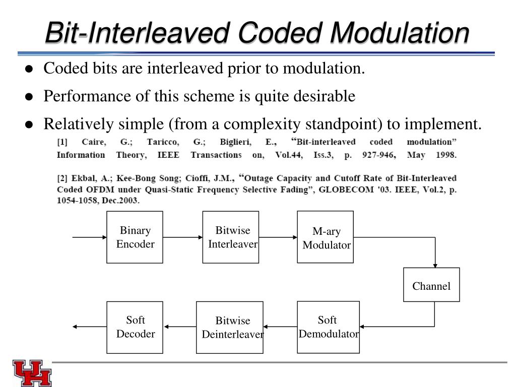 Bit-Interleaved Coded Modulation • Coded bits are interleaved prior to modulation. • Performance of this scheme is quite desirable • Relatively simple (from a complexity standpoint) to implement. Binary Encoder Bitwise Interleaver M-ary Modulator Channel Soft Decoder Soft Demodulator Bitwise Deinterleaver
